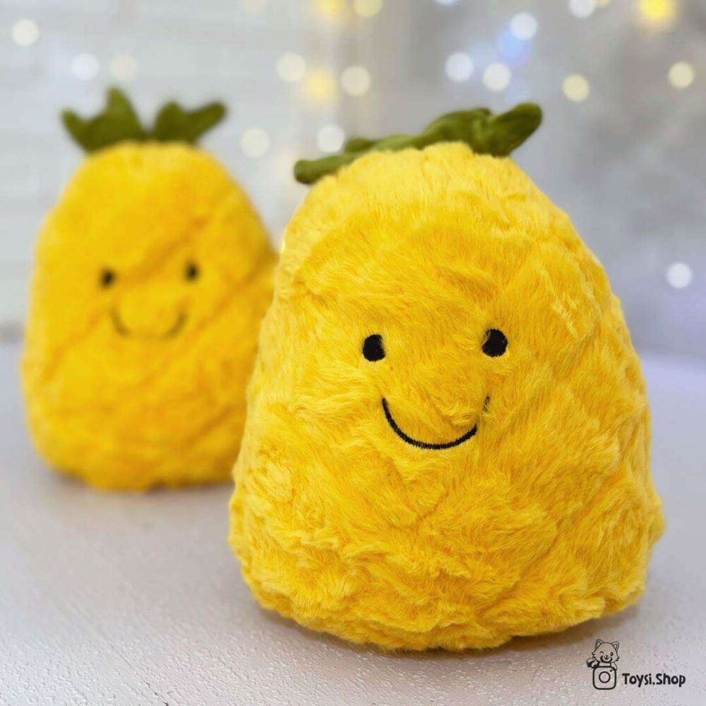 عروسک بالشتی آناناس یک عروسک زرد دوست داشتنی با لبخندی زیبا است. طراحی این عروسک به گونه ای است که بسیار مناسب استفاده در اتاق خواب است. شما می توانید از این عروسک بالشتی روی تخت خواب خود استفاده کنید. اگر آن را برای کودکان (سه سال به بالا) خود خریده اید آن را در تخت کودکان خود قرار دهید. عروسک گلابی بالشتی و عروسک موز بالشتی دیگر عروسک های بالشتی با رنگ زرد هستند.