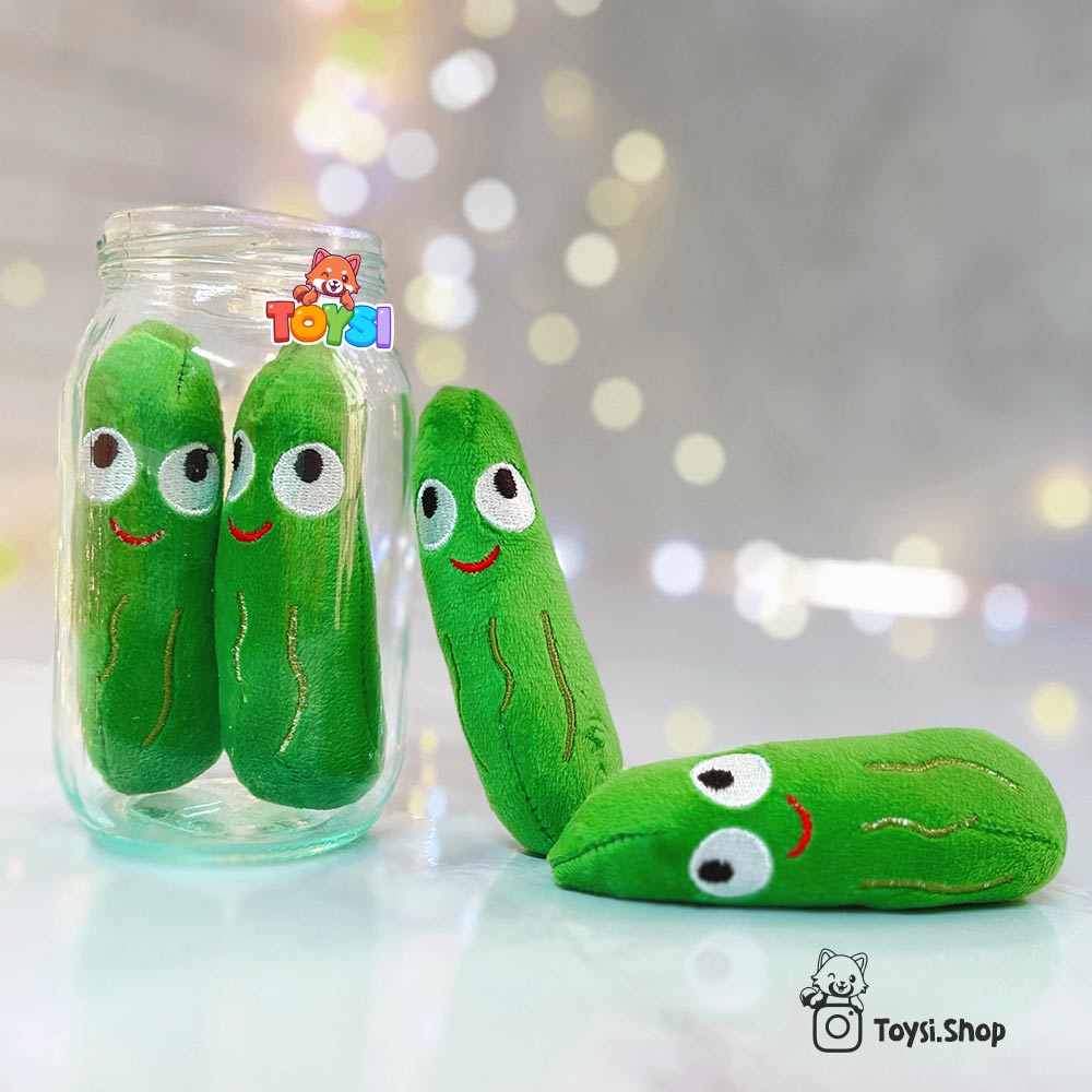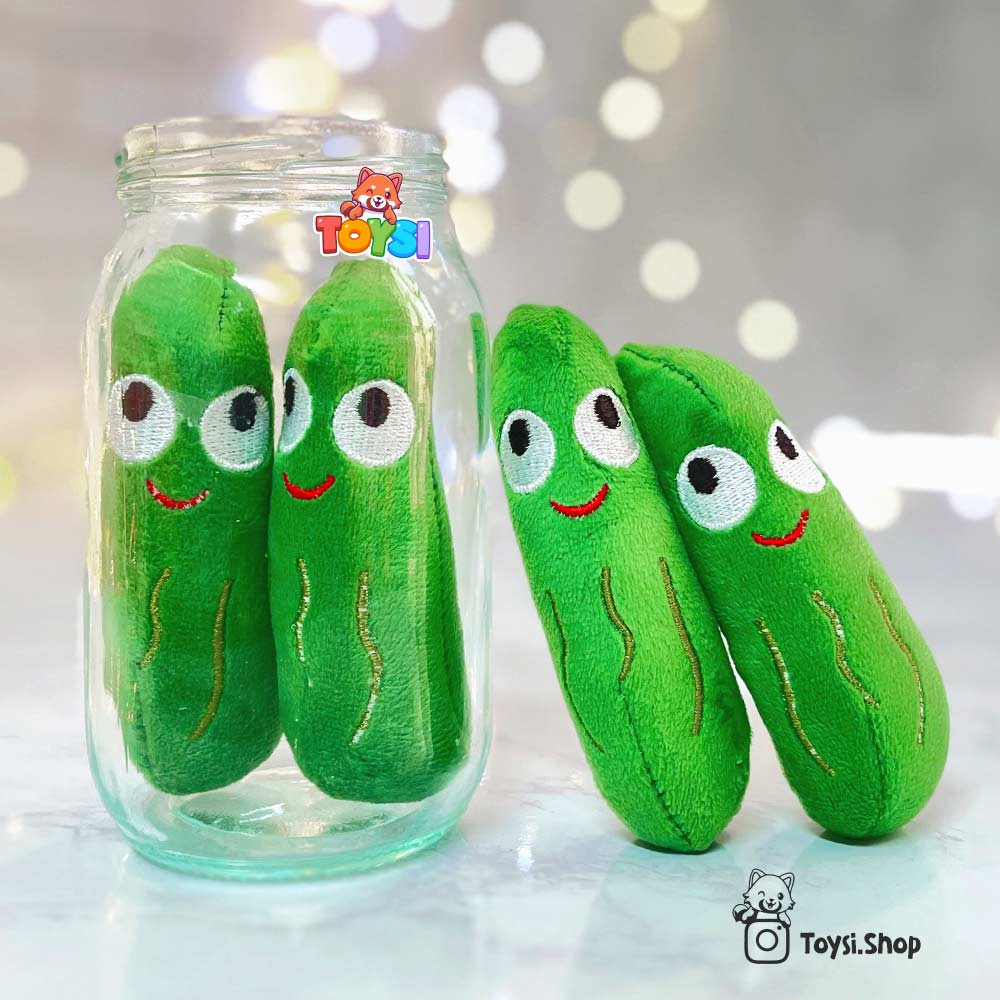 طراحی عروسک خیارشور بسیار خاص و جذاب است. در طراحی این محصول از یک شیشه استفاده شده که درون آن چهار عدد خیارشور پولیشی نرم و خوش رنگ قرار گرفته است. این خیارشورها بهراحتی قابل جدا شدن و قرار گرفتن مجدد داخل شیشه هستند و همین ویژگی ، این محصول را به یک اسباب بازی آموزشی و تعاملی تبدیل کرده است. رنگ بندی شاد ، فرم خیارشورها و جزئیات روی آن ها ، همه باعث شده اند که این عروسک برای کودکان بسیار سرگرم کننده باشد.